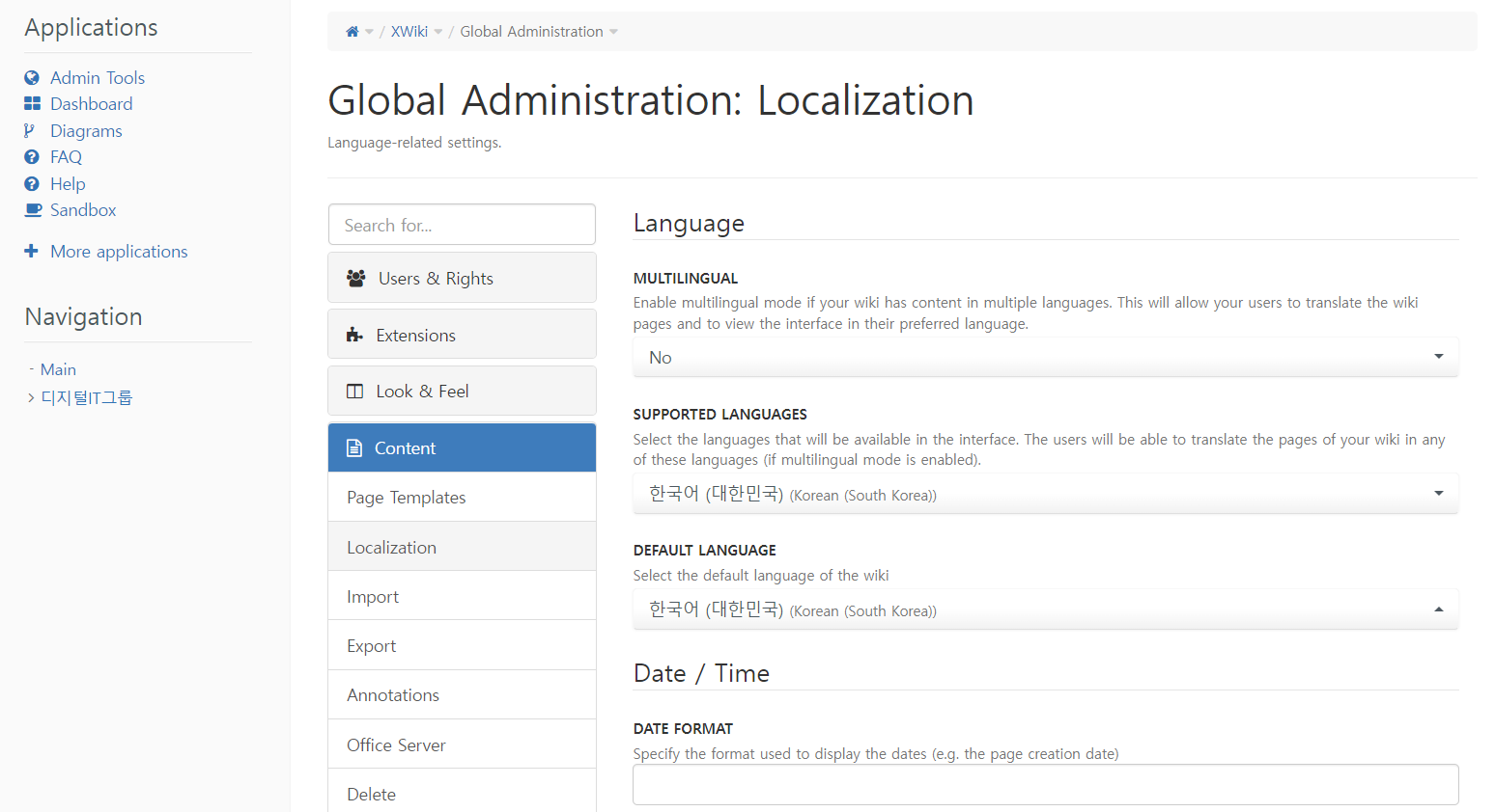 Administer Wiki -> Content -> Localization 에서 Default Language 를 한국어(korean)로 수정하면 이후 한글이 깨지지 않고 표출 됩니다.