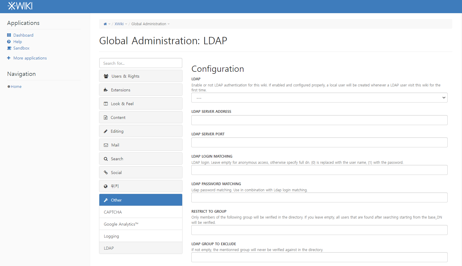 이후 서버를 재기동 하면 Administer Wiki -> Other -> LDAP 메뉴를 확인 할 수 있습니다.
