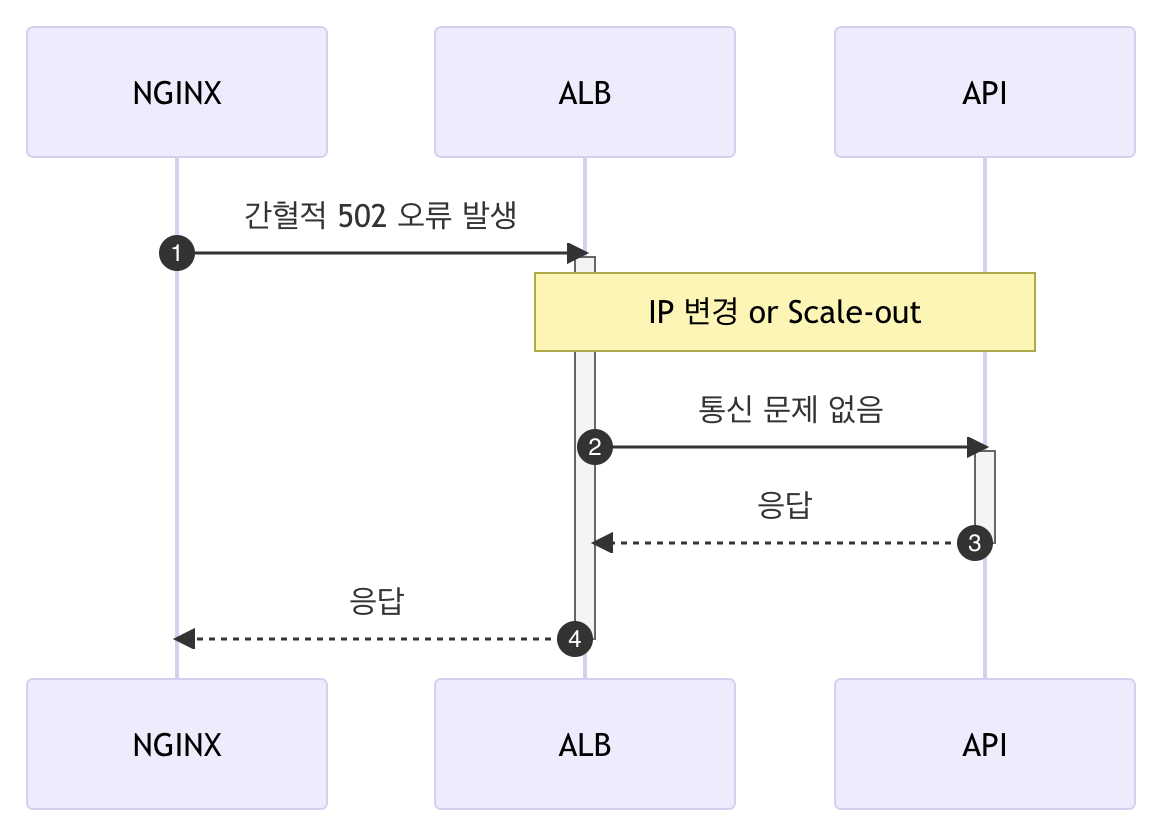 502오류가 간혈적으로 발생하여 원인을 찾지 못하고 있었는데, Nginx에서 위와 같이 동작하는지 알게되는 시간이었네요.