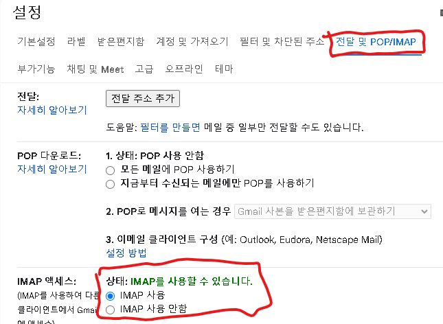 - 설정 > 전달 및 POP/IMAP